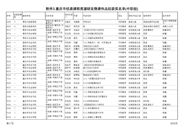 近日,根据《重庆市教育科学研究院关于遴选重庆市优质课程资源研发基地学校的通知》(渝教科院发〔2021〕17号)要求,市教科院组织专家对各基地学校研发的5862件微课作品进行了认真评审,我校作物生产技术团队和插花与花艺设计团队喜获佳绩,共获得一等奖20个,二等奖42个,三等奖30个,一等奖获得数与获奖总数均位列全市同类学校第一。