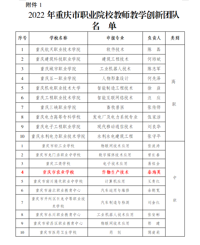 3月8日,重庆市教育委员会发布了公示了2022年重庆市职业院校教师教学创新团队和首批中职“双师型”名师工作室名单,我校“作物生产技术专业教学创新团队”获批重庆市教师教学创新团队立项。该教学团队拥有副高职称及以上教师 8 名,重庆市劳动模范1 名,行业企业专家5名,是一支政治思想素质过硬、教学水平高、研发能力强、社会服务成效突出的专兼结合双师型教师团队。近几年,该团队对接国家农业职业发展需求,围绕作物生产新技术优化人才培养方案、开展“教师、教材、教法”改革及实践、实施1+X职业技能等级考核、推进线上线下混合式教学、校企共建生产性实训基地等,教学成果丰硕,育人水平不断提升。