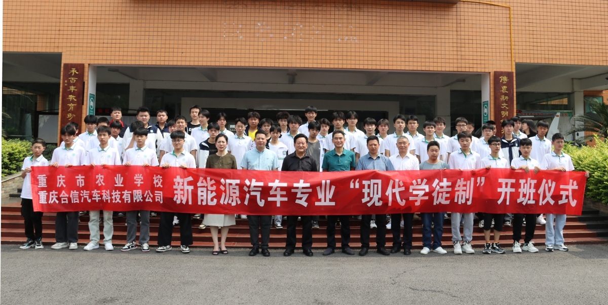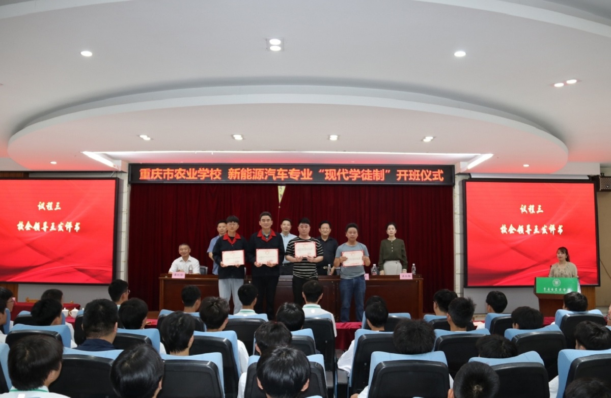 在学校开展“2023年职教活动月”系列活动之际,为全面落实立德树人根本任务,弘扬工匠精神和尊师重道的传统文化,深化产教融合、校企合作,推进我校新能源汽车与维修专业教学改革,5月4日上午,我校联合重庆合信汽车科技有限公司在学校德润厅成功举行了新能源汽车运用与维修专业现代学徒制开班暨拜师仪式。合信汽车科技有限公司总经理陈光来、产教融合事业部副总经理刘坤,学校校长王华平、党委书记邹世平、副校长肖红梅、农机系主任廖利华、农机系副主任李林芷以及农机系专业教师、企业师傅和2022级现代学徒制班的全体学徒参加了此次拜师仪式。