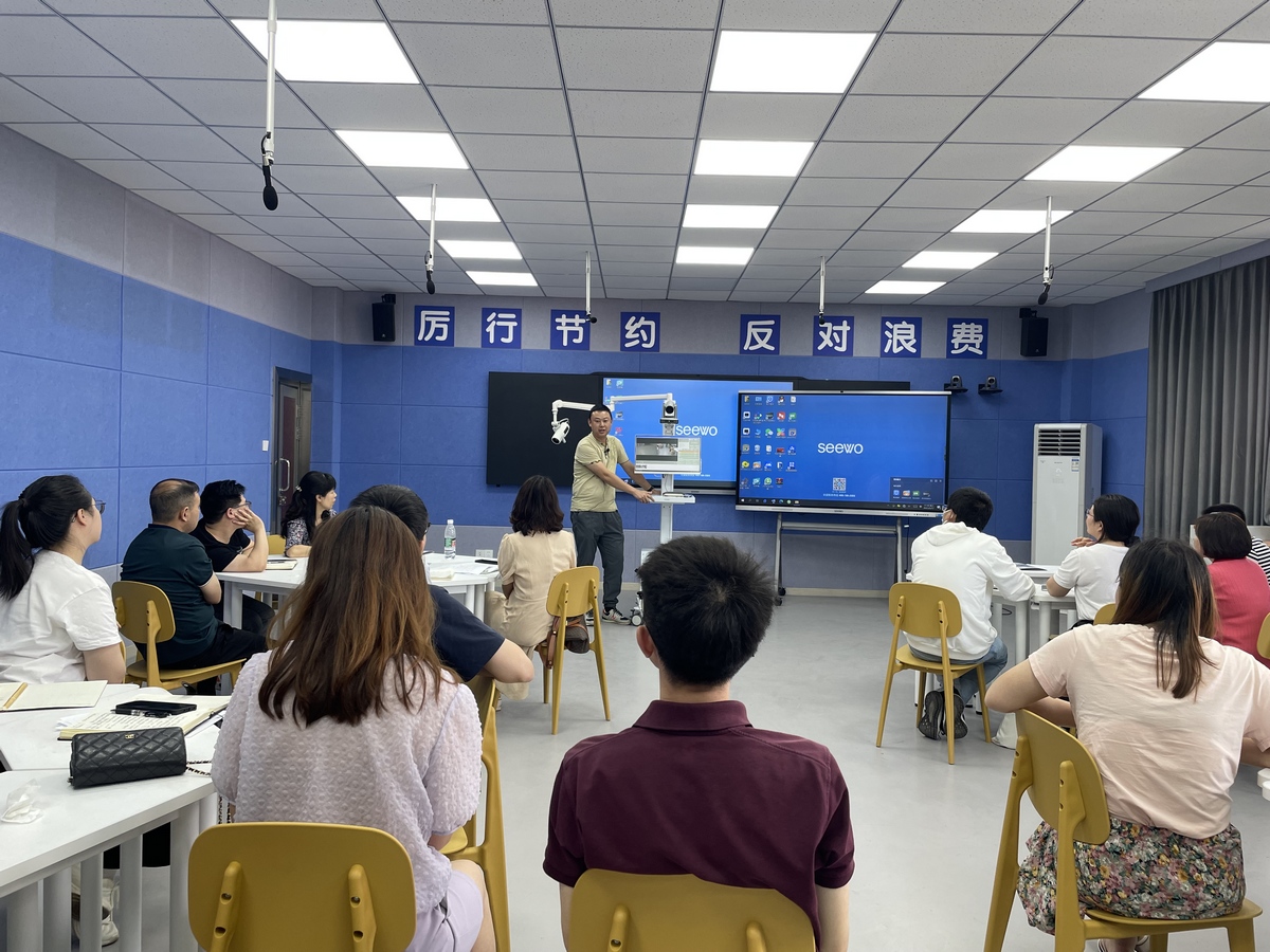 4名培训讲师针对希沃白板、移动实训推车、录播设备等使用,以理论讲解与实践操作相结合的方式进行授课,我校老师认真聆听、详细记录、踊跃提问、反复实践,积极提高课堂教学与信息技术整合能力,学习氛围浓厚。
