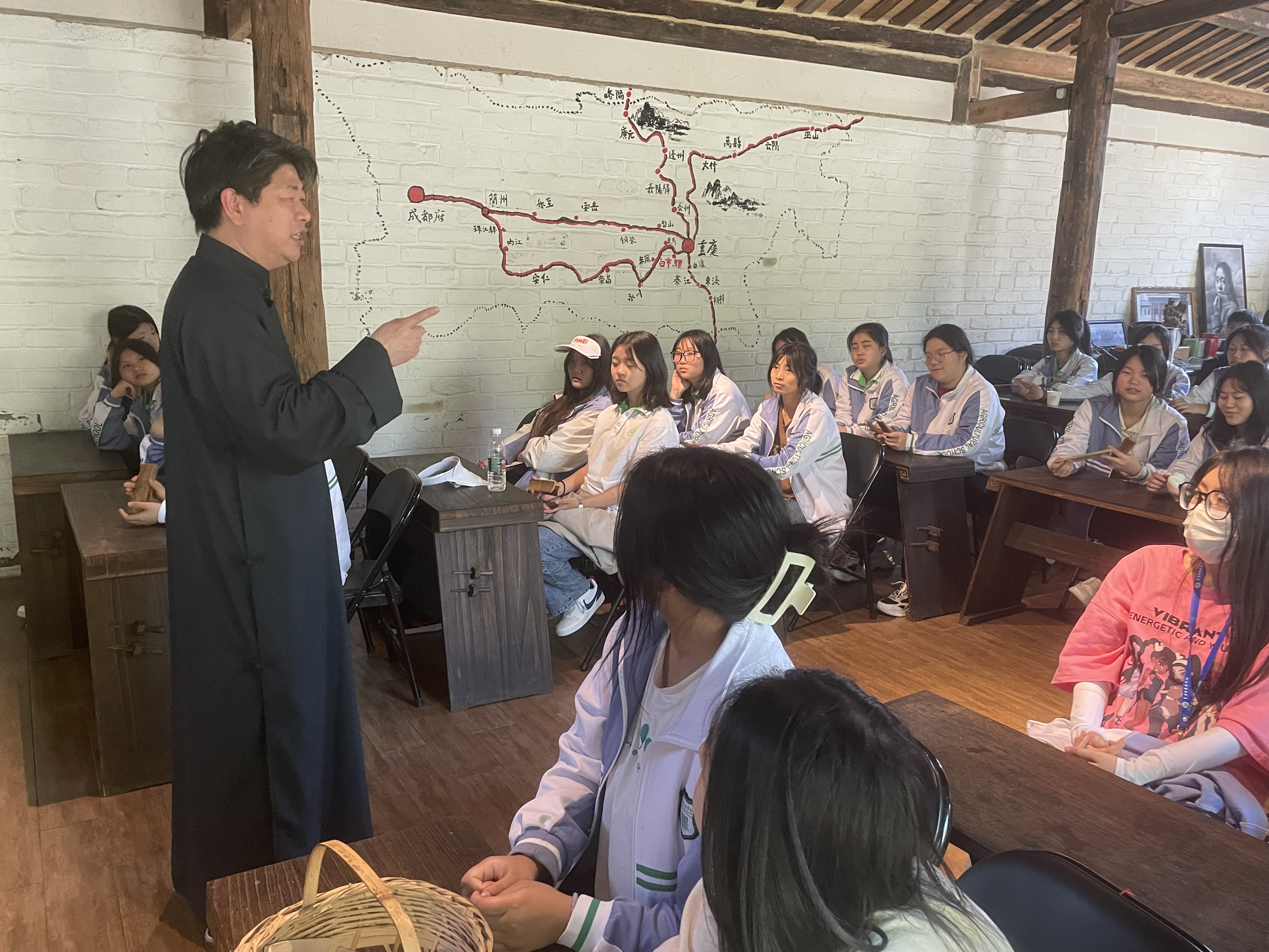 谢牻老师是我校休闲农业生产与经营专业聘请的非遗大师,师承国家级非遗走马故事刘远杨、走马神歌邱邦祥,现为高新区非遗项目白市驿喊堂传承人、九龙坡区曲艺家协会会员。在长达2个小时的授课中,谢老师给同学们介绍了走马故事、走马神歌、木洞山歌、川江号子、白市驿喊堂民俗、莲花落唱打、四川评书、四川金钱板、四川荷叶、四川车灯等多个非遗项目,每一项都通过起源的讲解、内容的表演让学生了解,并现场教学让学生亲身感受,课堂气氛活跃、掌声不时响起。