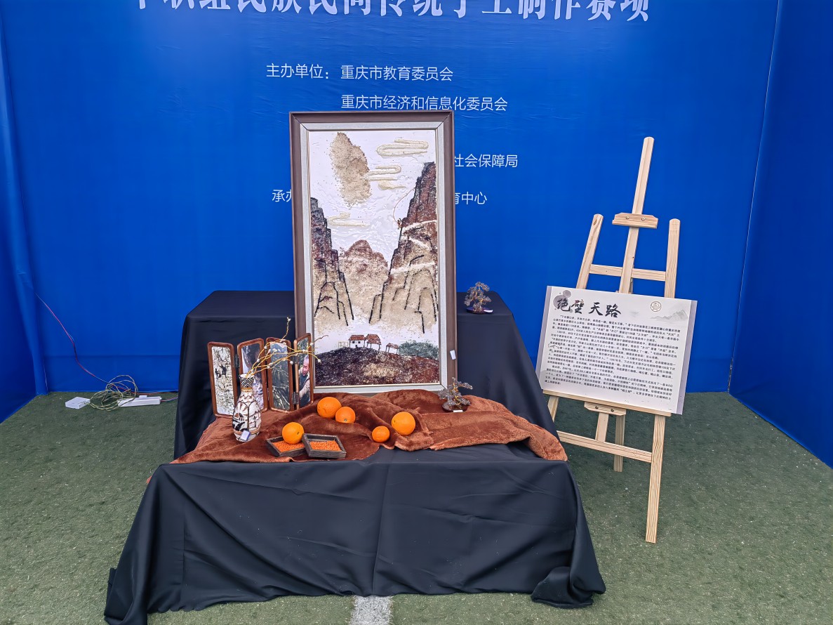 我校4名学生沉着冷静,通力合作,展示出良好的竞技状态和较高的手工制作水平。我们的作品是以重庆市巫山县竹贤乡下庄村绝壁凿路为背景,用三色藜麦、糙米、黑米、红扁豆、糯米、等五谷杂粮为画笔,表现了下庄村人通过在悬崖峭壁上以最原始的方式开凿山路,凿出了“不甘落后、不等不靠、不畏艰险、不怕牺牲”的下庄精神。在党和国家政策的引领下,下庄村发挥资源优势,大力发展柑橘产业,带动80余户当地村民增收,从此贫脊的土地上长出了“金银树”,开出了“幸福花”,结出了“致富果”。和谐富足的美丽乡村,将激励更多的人加入乡村振兴“唱主角”,让更多梦想在下庄精神的土壤上绚丽绽放!经过激烈的角逐,我校作品荣获三等奖的好成绩。