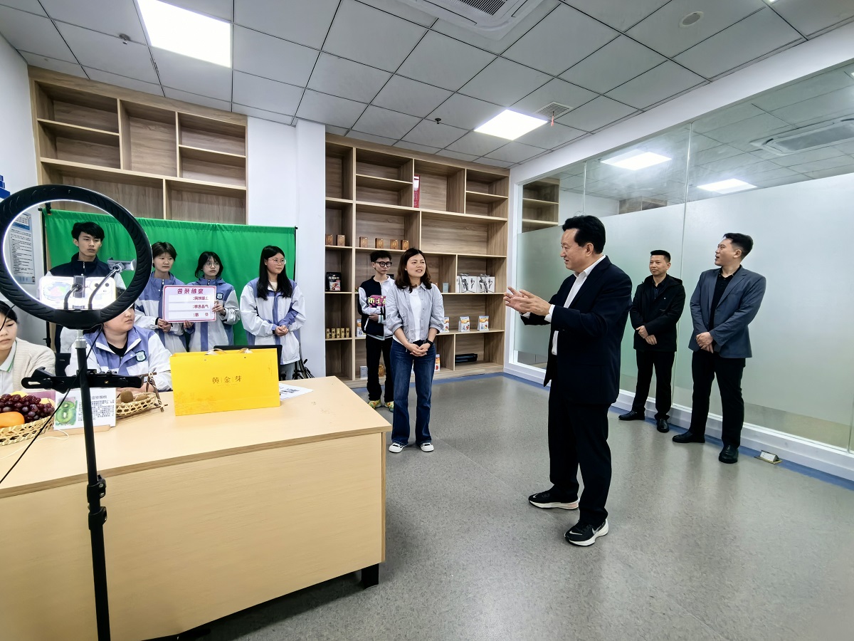 在考察过程中,刘光会书记一行首先参观了学校的电商直播实训室。这里设备齐全,环境优雅,电子信息系的学生们正在模拟电商直播售卖农产品的场景,学生们通过直播平台,向考察组一行演示如何向观众展示农产品的特色与优势,王华平校长详细讲解了电商直播的运营模式和技巧,为三江村今后开展电商直播提供了宝贵的经验和启示。