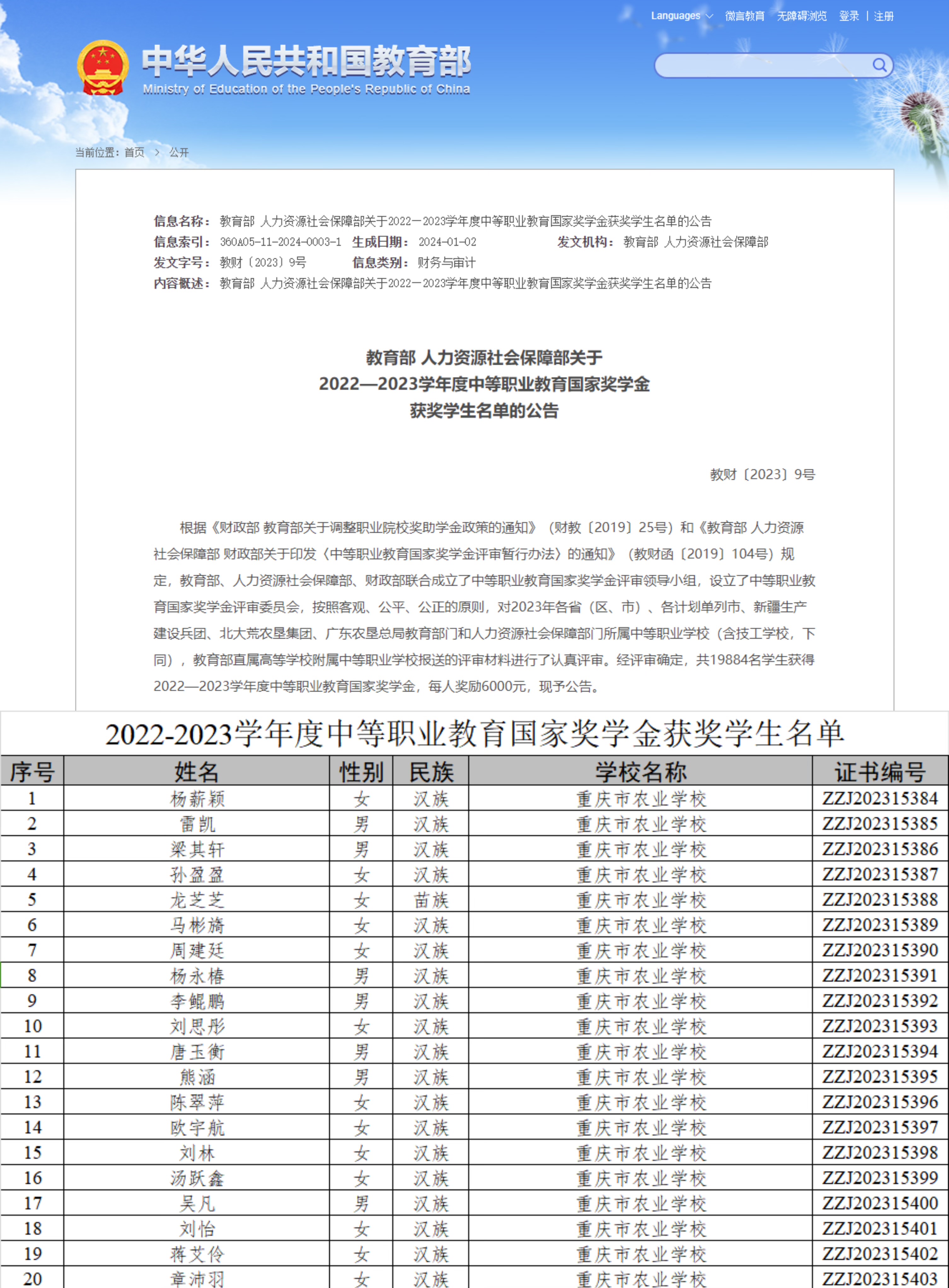 我校2022-2023学年度中职国家奖学金获奖学生名单