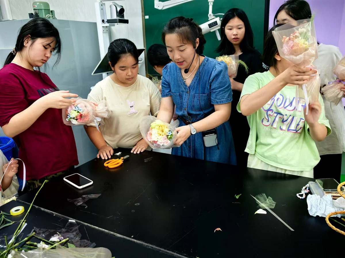 插花艺术课程由经验丰富、技艺精湛的张馨月老师授课。她详细讲解花材选择、色彩搭配和造型设计,并亲自示范,引领同学们进入充满艺术气息的世界,同学们制作出了精美的插花作品。