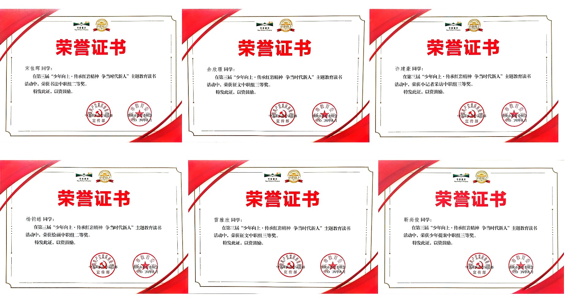 近日,由重庆市委宣传部、市教委联合开展的第三届“少年向上·传承红岩精神争当时代新人”主题教育读书活动圆满落幕,我校学生表现出色,共斩获10个奖项,其中,二等奖2项、三等奖4项、优胜奖4项。舒适、杨双、康敏、王革、冉迁、李玲、严太福、余勇等8名老师获指导老师奖。