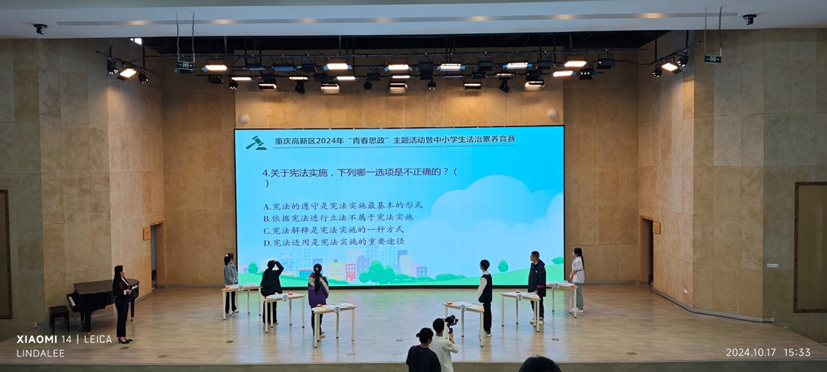 2024年10月17日,高新区“学宪法,讲宪法”法治素养知识竞赛在重师附二小举行。电子信息系23电子商务1班学生贺秋怡在比赛中展现了良好的法治素养,最后荣获一等奖。