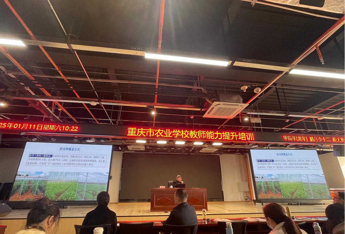 随后,重庆市农业科学院罗云米研究员《蔬菜设施类型及轻简高效管理技术》讲座围绕蔬菜产业发展概况、设施蔬菜生产类型、轻简高效管理技术三方面,概述了重庆蔬菜产业产量面积、生产供应、销售情况、产业难点,参照全国对比重庆设施蔬菜发展概况,详细介绍塑料薄膜棚、温室等现代蔬菜设施多种类型,根据重庆蔬菜栽培制度推广了无土栽培、集约化育苗、嫁接栽培、水肥一体化、土壤改良、全膜覆盖、蔓生蔬菜无支撑栽培等轻简高效栽培技术。
