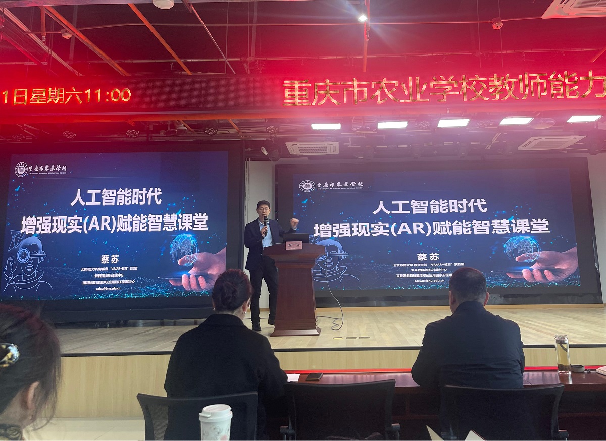 最后,北京师范大学教育学部博导、教育学部“VR/AR+教育”实验室成员蔡苏教授带来了《人工智能时代增强现实(AR)赋能智慧课堂》的专题培训。蔡苏将虚拟的森林、星系场景运用到学校广场、培训会场,通过现场为学校量身创编不同风格校歌、唐代诗人李白根据与会教师外貌衣着写作诗歌等生动案例与互动体验,展示了AR技术打破传统教学界限、在不同学科创造沉浸式学习环境、激发学习兴趣与创造力的显著成果。他还指出了未来教育改革方向,鼓励教师们善用新技术、超越知识学习关注学习品质,培养独立思考且有正确判断力的人。