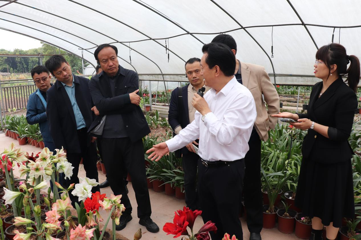 图2 王华平书记向考察团一行展示学校植物科学实训基地繁育的朱顶红