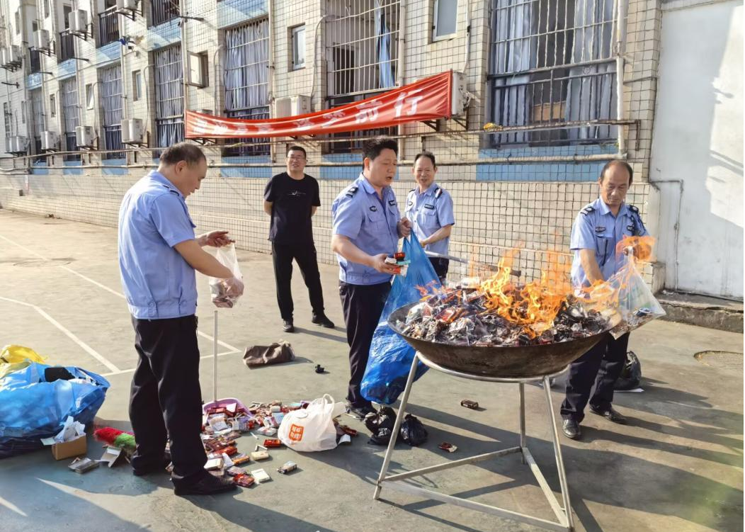 图3 保卫人员将近期查获的违规携带进校的香烟进行集中公开销毁