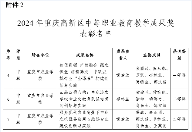 近日,重庆高新区2024年教学成果奖评选结果正式公布。我校农业机械系申报的三个项目全部获奖,共斩获一等奖1项、二等奖2项。