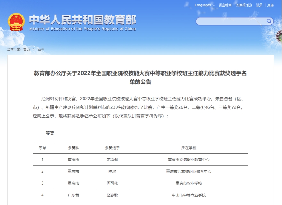 经网络初评和决赛,2022年全国职业院校技能大赛中等职业学校班主任能力比赛成功举办。1月18日教育部办公厅发布了《关于2022年全国职业院校技能大赛中等职业学校班主任能力比赛拟获奖选手名单的公示》,我校何可依老师荣获一等奖,为我校班主任队伍能力建设和“双优”建设添上了浓墨重彩的一笔,也为我校在新的一年新的征程上带来了新的憧憬。全国职业院校技能大赛中等职业学校班主任能力比赛由教育部主办,来自各省(