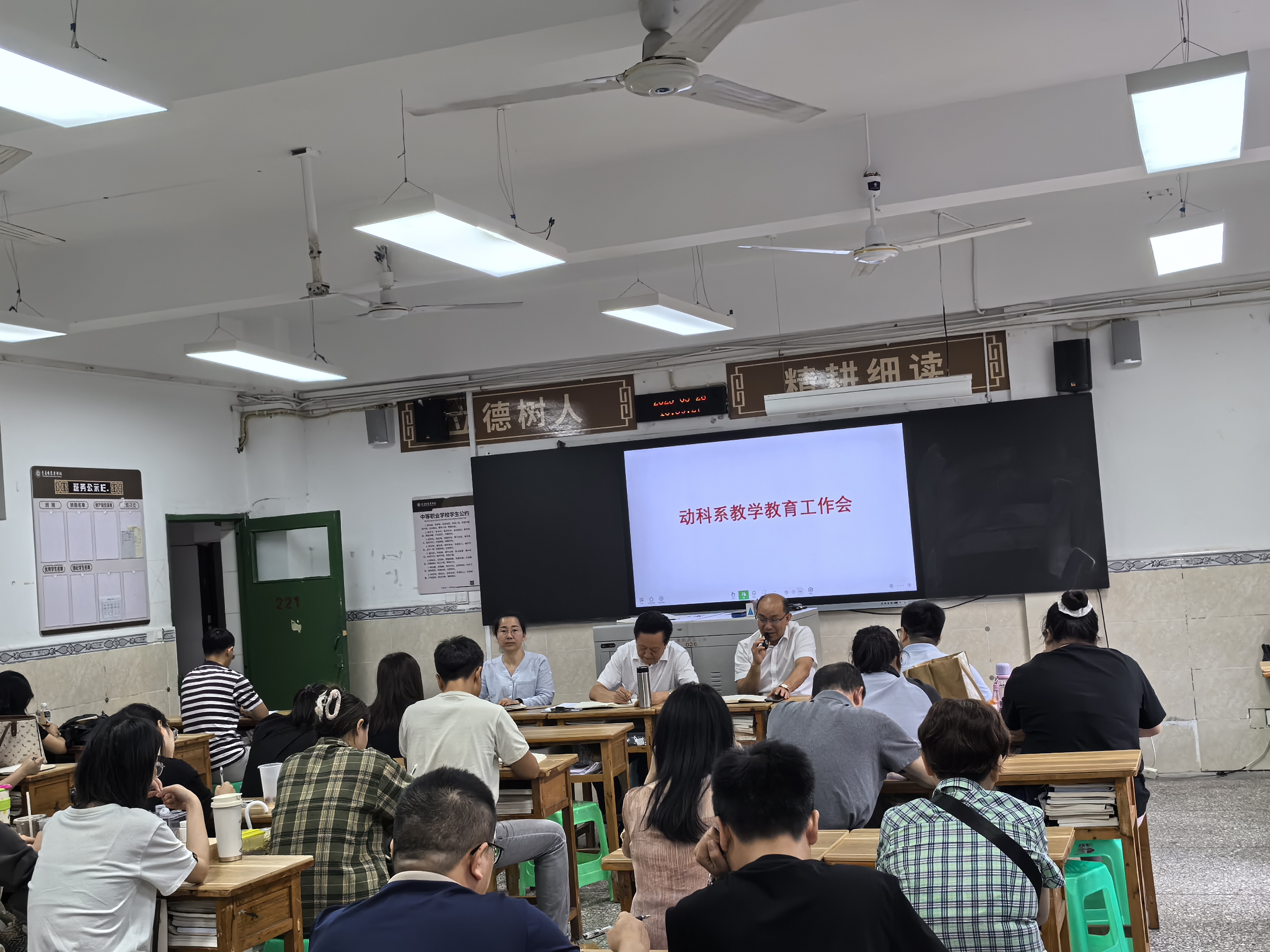 2025年5月28日下午,重庆市农业学校动物科学系召开全体教职工及班主任工作会议,党委书记王华平出席会议并作总结讲话。会议围绕教育教学核心工作展开部署。第一,强调教育与教学是相辅相成的有机整体,要求教师在知识传授中融入育人理念,实现"三全育人"目标。第二,对教学规范提出具体要求:教师须严格按时上课,落实备课制度,动态更新教学内容,注重与畜牧兽医行业前沿技术接轨,各学科需统一教学进度标准。